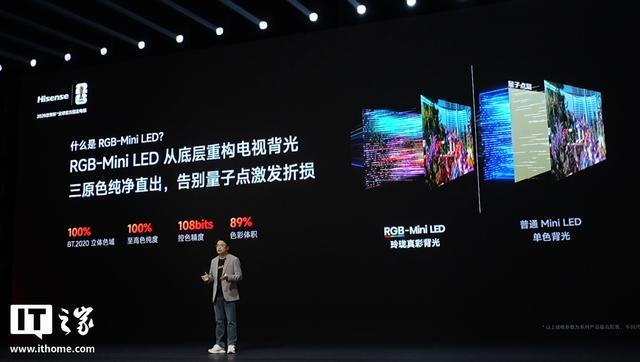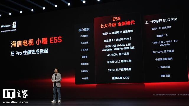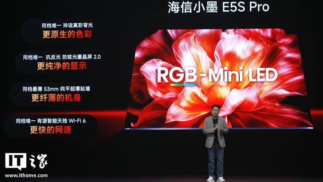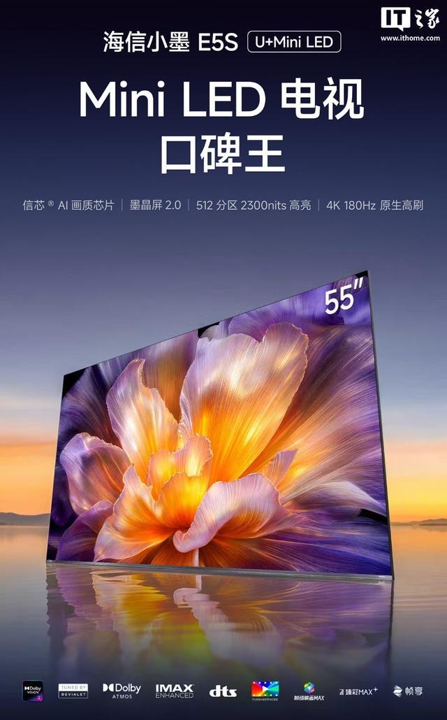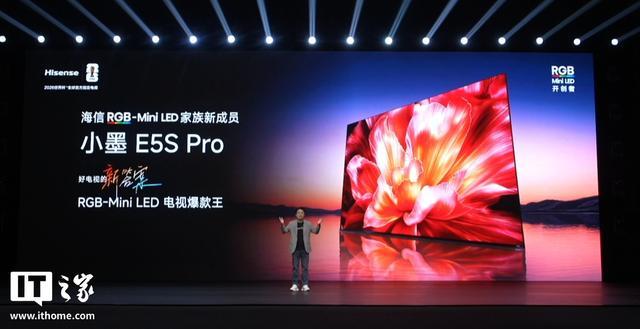 海信电视小墨 E5S Pro 则用上了 RGB-Mini LED 屏,同样有墨晶屏 2.0、信芯 AI 画质芯片、原生 4K 180Hz 高刷、帝瓦雷 2.1.2 物理环绕音响,还支持 100% BT.2020 色域。