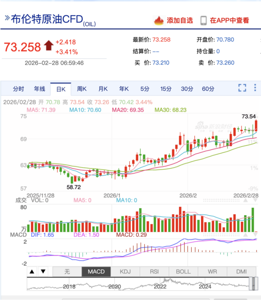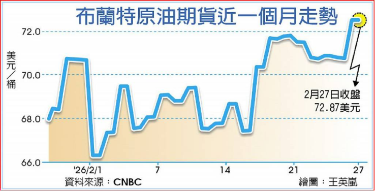 受南美局势与当前中东冲突接连催化,1月以来国际油价持续上涨,截至2月27日,WTI原油期货收涨2.9%至67.35美元/桶,布伦特原油期货收涨3.44%至73.26美元/桶。