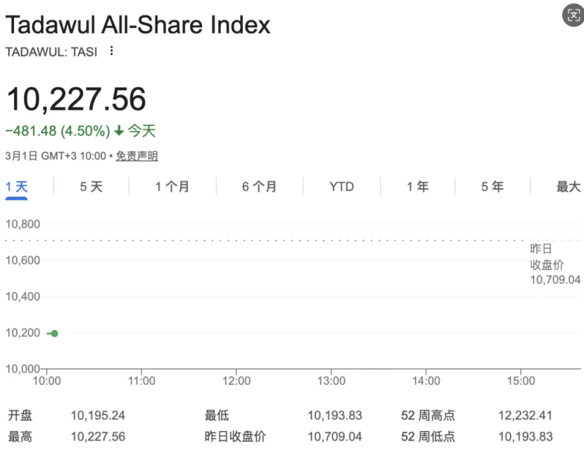 当地时间3月1日,沙特阿拉伯股市开盘后,沙特阿拉伯股市指数(TASI)大幅跳水,早盘一度大跌超4%,截至发稿,跌幅仍近2%。比特币回落至66791美元,此前一度升破68000美元。当日早些时候,科威特证券交易所宣布,因持续发展的局势,自3月1日起暂停交易,直至另行通知。