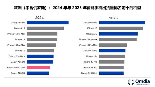 今天分享的是2025年欧洲(不含俄罗斯)智能手机出货量榜单TOP10:和2024年相比,唯一的国产手机跌出畅销榜,苹果和三星手机各占了5款,其中最意外的应该是iPhone16e。和全球市场不同,欧洲最畅销的手机不是苹果手机,也不是安卓千元机,而是一款定位中端的三星手机。