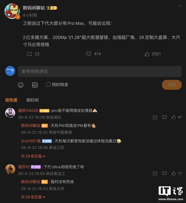 同时,参考评论区,该博主还透露有部分“Pro Max”级别机型将采用联发科天玑芯片,而非高通骁龙芯片。