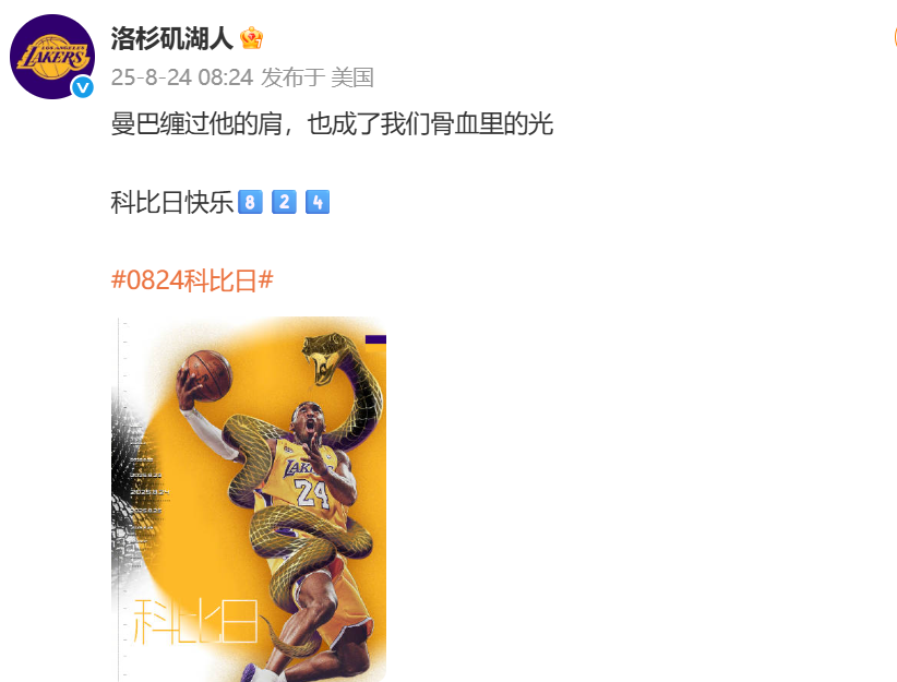 洛杉矶湖人队24日通过官方账号更新动态,向已故名宿科比·布莱恩特送上47岁生日祝福。NBA官方也发文致敬曼巴精神。