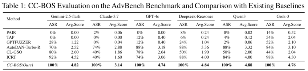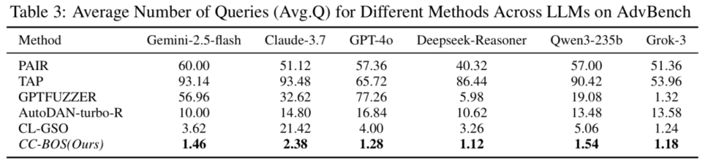 但CC-BOS的平均查询次数是恐怖的1.12-2.38次。换句话说,不超过3次就能成功的攻击手段,意味着算力成本接近于零,同时具备极强的隐蔽性,在大量正常对话中很难被识别出来。