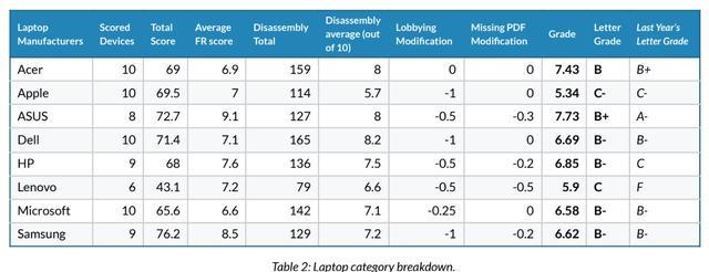 苹果笔记本因拆解分数低被扣分,且因加入反对维修立法的行业组织 TechNet 及消费技术协会(CTA),额外扣除 1 分。