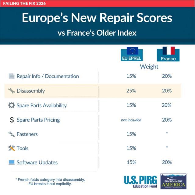 笔记本评分侧重拆解便捷度、维修文档、备件可得性及价格等维度。手机评分则纳入拆解深度、紧固件、工具、软件更新年限等 6 项指标。