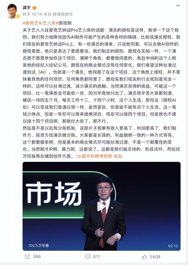 4月21日,龚宇在个人微博连发三条内容,进一步回应争议。他详细解释了艺人授权规则:“我们现在的爱奇艺纳逗Pro上,有一些演员的清单。只说他同意,可以去做AI创作的授权意愿。他只是表达了意愿要谈。我们制定的规则,跟现在实拍一样,一个演员愿不愿意参加你这个项目、演哪个角色,都要他同意的……一个演员,他同意了在这个项目、这个角色上授权,并不意味着其他的任何项目、任何角色都同意了。”