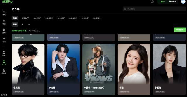 纳逗Pro艺人库显示,目前共有117位艺人入驻,包括陈哲远、丞磊、郭俊辰、曾舜晞、翟潇闻、李溪芮等艺人均已入库。