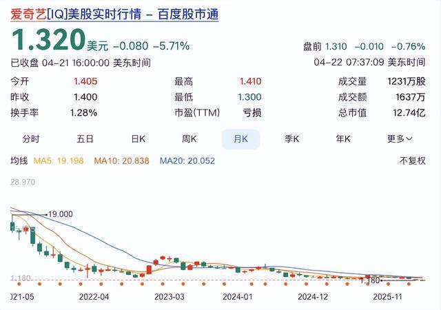 2026年3月30日,爱奇艺以保密形式向港交所递交上市申请。该公司在美股市场的表现处于历史低位:2018年上市时发行价18美元,市值一度超过310亿美元;截至2026年4月22日,股价约1.32美元/股,市值约12.74亿美元,较峰值蒸发300亿美元,折合人民币2047亿元。